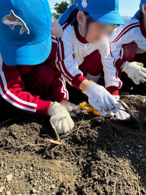 軍手をつけて、小さな手で一生懸命土を掘る姿には、日頃の園での経験やたくましさがにじみ出ていました。